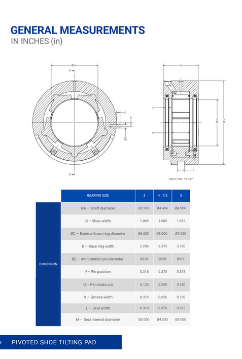 The pivoted shoe tilting pad journal bearing consists of a base ring with five journal shoes located both circumferentially and radially by stops pins and axially by retainer pins.